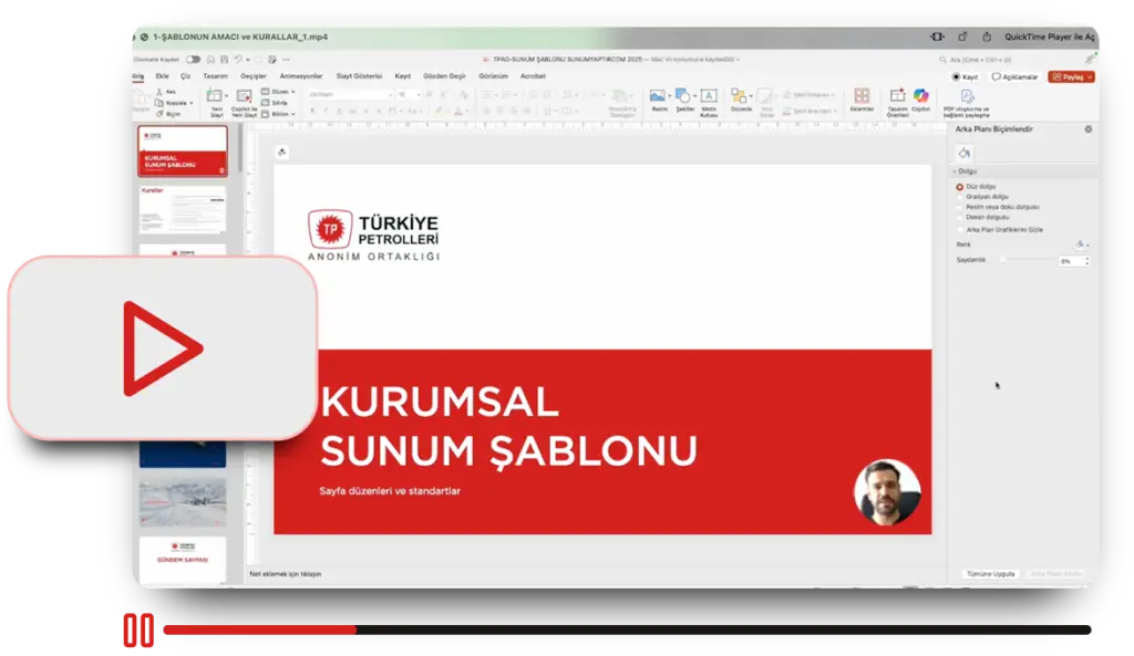Kurumsal PowerPoint şablonu hazırlandıktan sonra, şablonun nasıl kullanılacağını gösteren uygulamalı video kayıtları hazırlanır. Kurumsal sunum ihtiyaç senaryoları netleştirilir.
