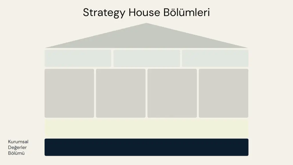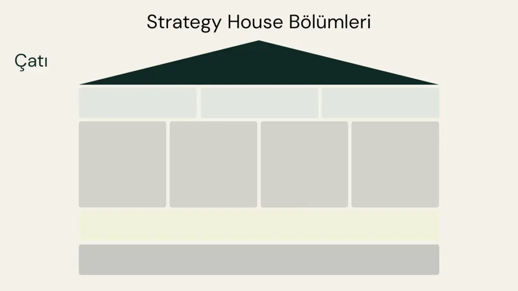 Bu model, stratejiyi bir evin mimari bölümleri gibi ele alır: Yönü belirleyen bir çatı, yükü taşıyan sütunlar ve evi ayakta tutan temel.