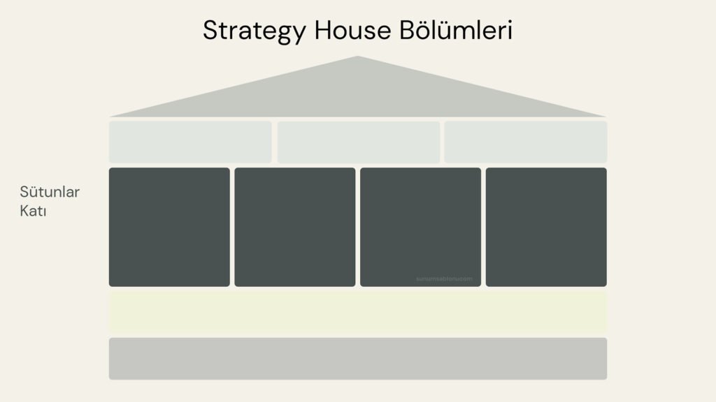 Stratejiyi görsel bir “ev” metaforuyla sunan bu model, vizyonunuzu “çatı” katında konumlandırırken, hedeflerinizi sağlam “sütunlar” üzerine inşa etmenize olanak tanır.